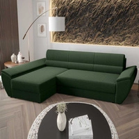 Ecksofa mit Schlaffunktion Fogu III grün linke Seite stilvolles Ecksofa mit Armlehnen Container für Bettzeug Kordelstoff