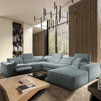 Ecksofa mit Schlaffunktion Viano grau blau links stilvolles Ecksofa mit interessanter Form verstellbare Kopfstützen Zierkissen