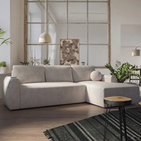 Ecksofa mit Schlaffunktion Colio beige rechte Seite stilvolles Ecksofa mit interessanter Form Velourstoff Zierkissen Ball