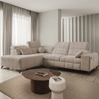 Ecksofa mit Schlaffunktion Penejos IX beige linke Seite stilvolles Ecksofa mit Bettzeugcontainern komfortable verstellbare Kopfstützen
