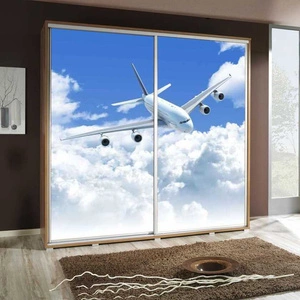 Artistino 155 cm Schiebeschrank mit Flugzeuggrafik wengefarbener Schrankkorpus aus 22 mm starker Platte