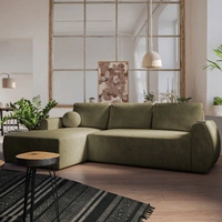 Ecksofa mit Schlaffunktion Colio oliv linke Seite stilvolles Ecksofa mit interessanter Form Velourstoff Zierkissen Ball