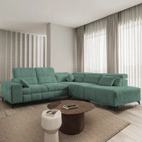 Ecksofa mit Schlaffunktion Penejos IX grün linke Seite stilvolles Ecksofa mit Bettzeugcontainern komfortable verstellbare Kopfstützen
