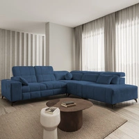 Ecksofa mit Schlaffunktion Penejos IX blau rechtsseitig stilvolles Ecksofa mit Bettzeugcontainern komfortable verstellbare Kopfstützen