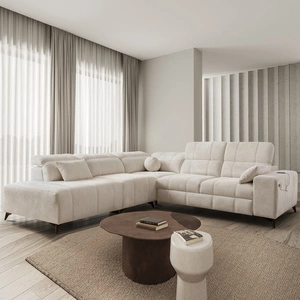 Ecksofa mit Schlaffunktion Penejos IX creme linke Seite stilvolles Ecksofa mit Bettzeugcontainern komfortable verstellbare Kopfstützen