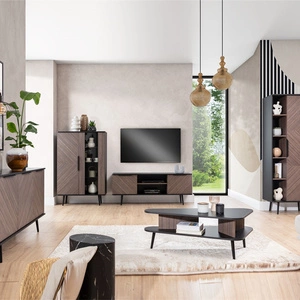 Set von Wohnzimmermöbel Kioto III Eukalyptus stilvolles Design elegante Möbel auf einem Metallrahmen schwarz subtilen Griffen unterstützt