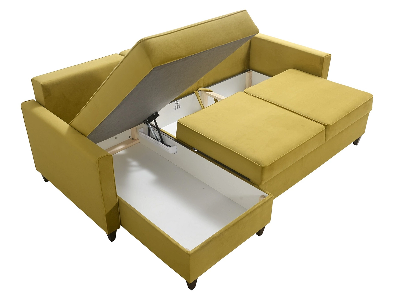 Ecksofa mit Schlaffunktion Terni ist ein Vorschlag für ein äußerst praktisches und funktionelles Möbelstück, das sich durch Minimalismus im skandinavischen Stil auszeichnet. Das Ecksofa garantiert höchsten Komfort bei der täglichen Entspannung im Wohnzimmer, im Schlafzimmer, im Gästezimmer oder in jedem anderen Raum, in dem Sie dieses äußerst modische und moderne Ecksofa aufstellen möchten! Die Struktur der Ecke wurde vollständig mit einem Stoff aus Samt überzogen samt Amor Samt 4311.
