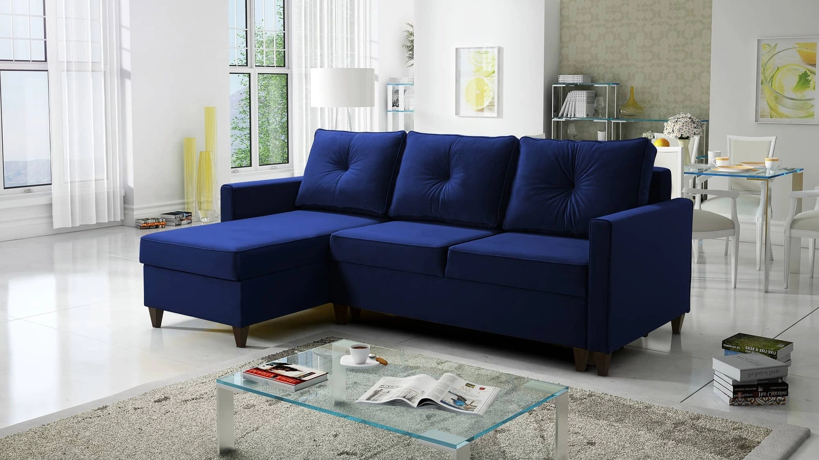 Ecksofa Terni in Marineblau ist ein stilvolles Stück, das perfekt in kleinere Räume passt.
