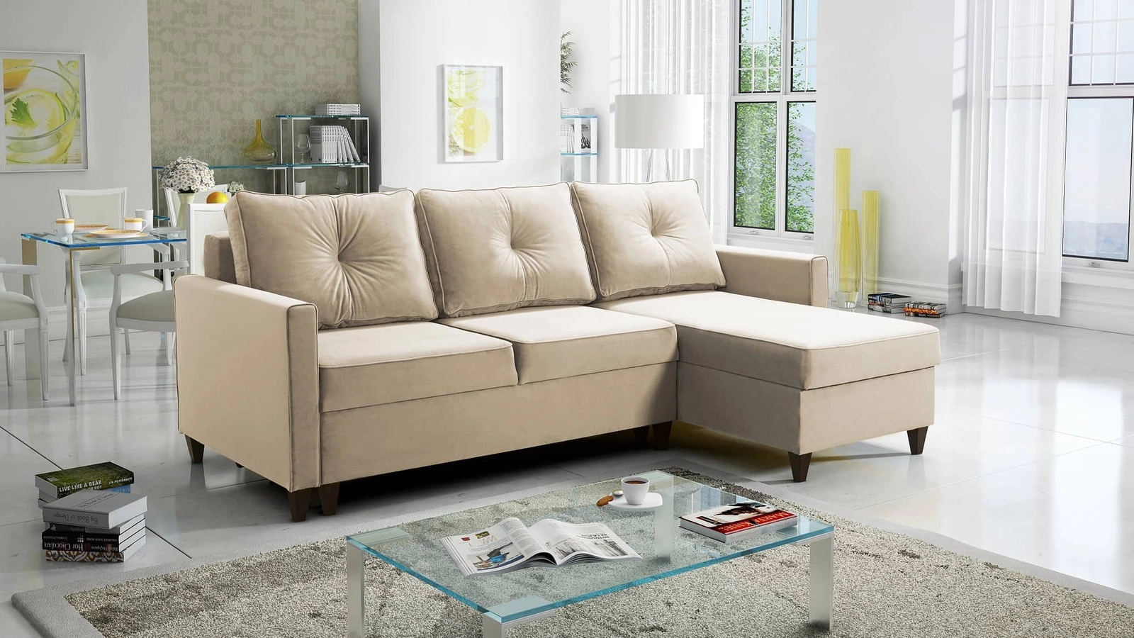 Ecksofa mit Schlaffunktion Terni creme rechts praktisch und funktionell, ausgestattet mit geräumigen Behältern für Bettzeug