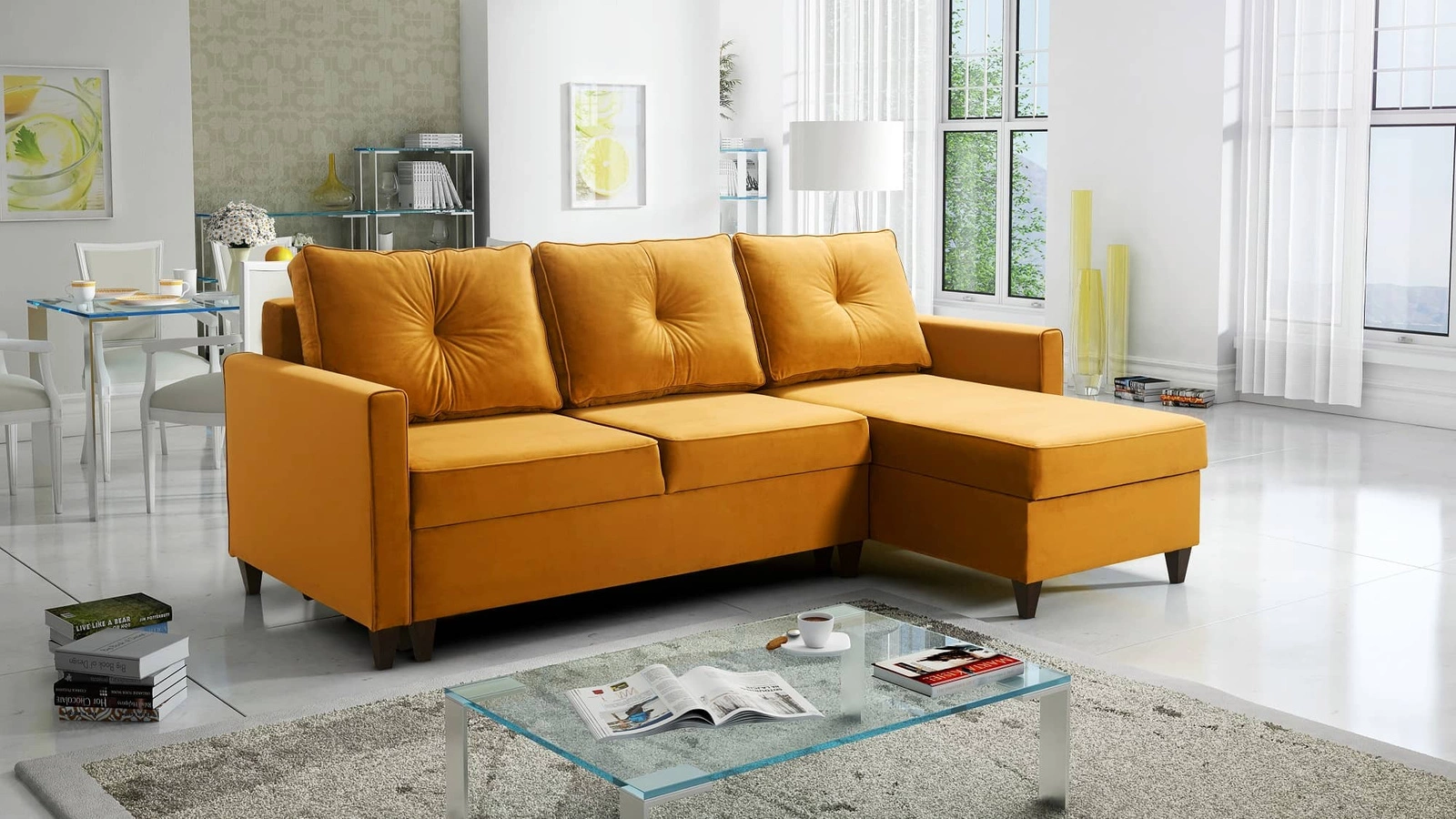 Ecksofa mit Schlaffunktion Terni gelb rechts praktisches und funktionelles Ecksofa mit geräumigen Behältern für Bettzeug