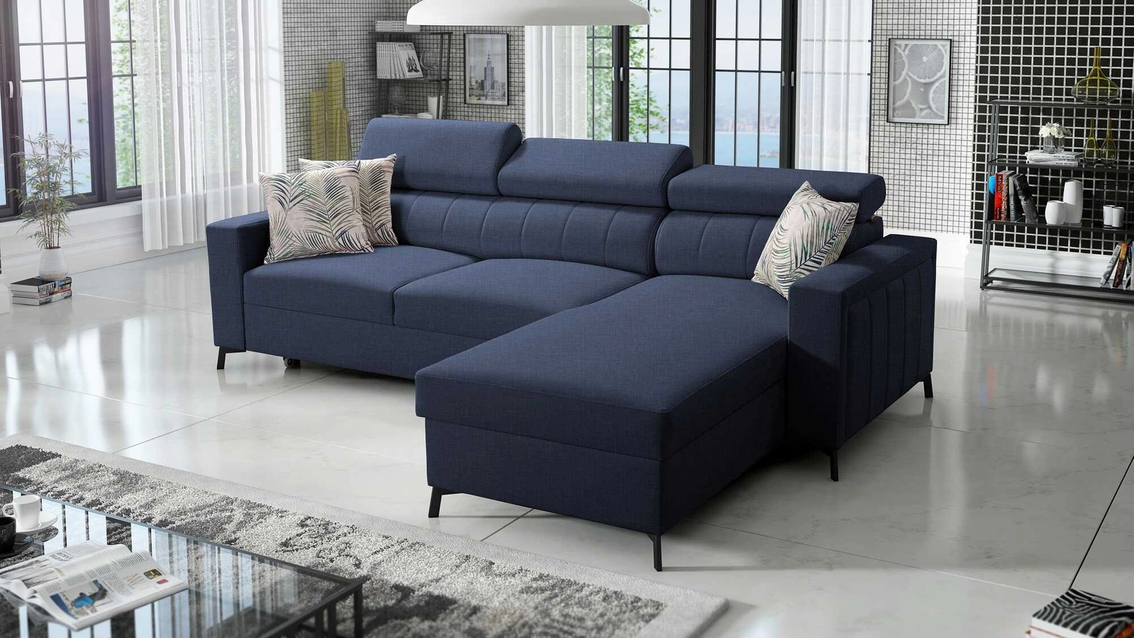 Ecksofa Savona in Marineblau mit verstellbaren Kopfstützen ist ein elegantes Möbelstück, das zu jeder Einrichtung passt.