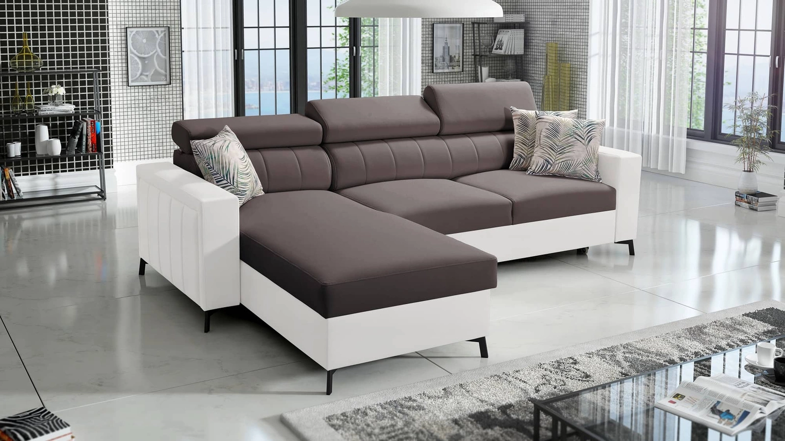 Ecksofa Savona in Braun/Weiß mit verstellbaren Kopfstützen ist ein elegantes Möbelstück, das sich in jede Einrichtung einfügt.