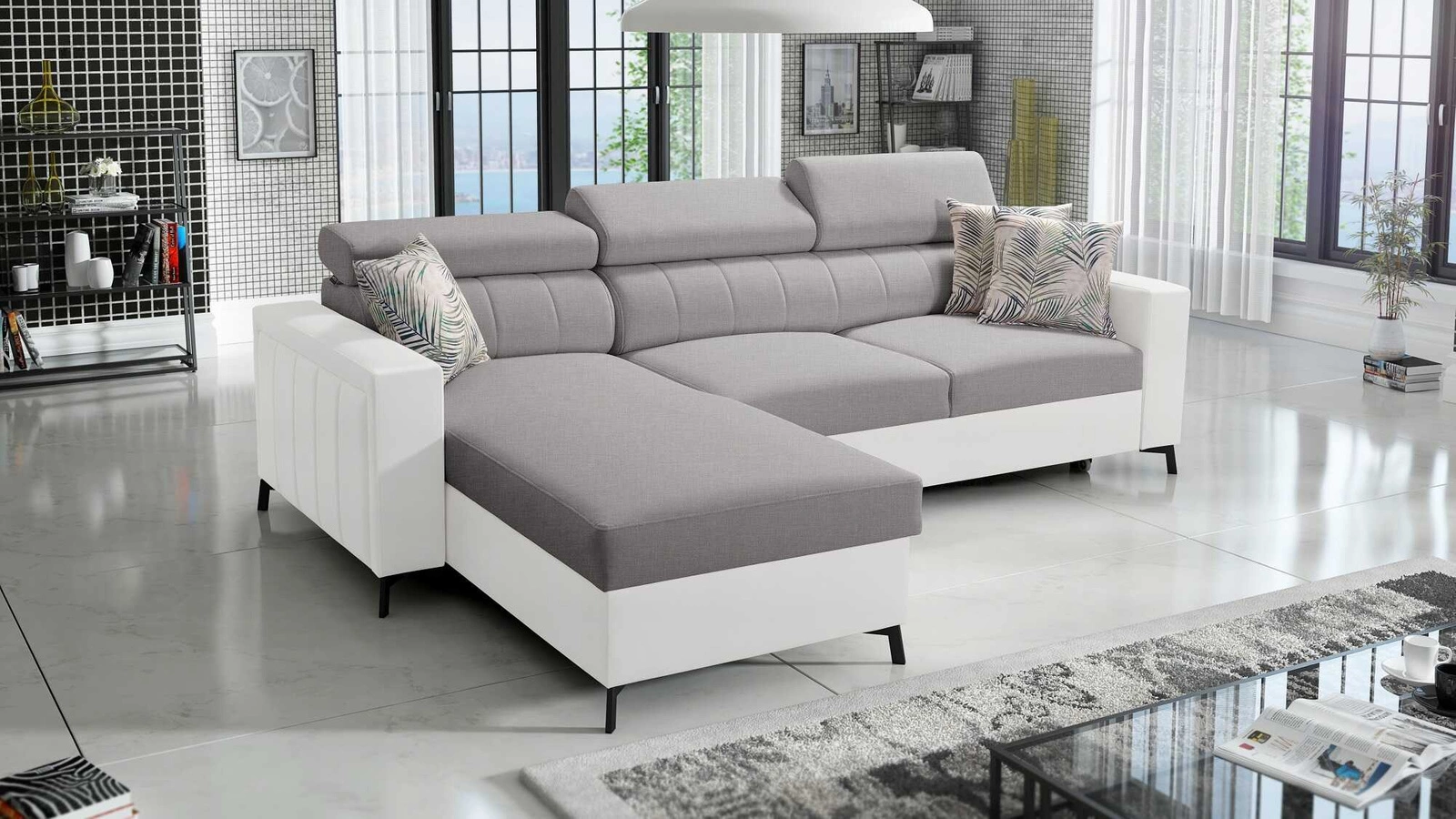 Ecksofa Savona in Hellgrau/Weiß mit verstellbaren Kopfstützen ist ein elegantes Möbelstück, das zu jeder Einrichtung passt.