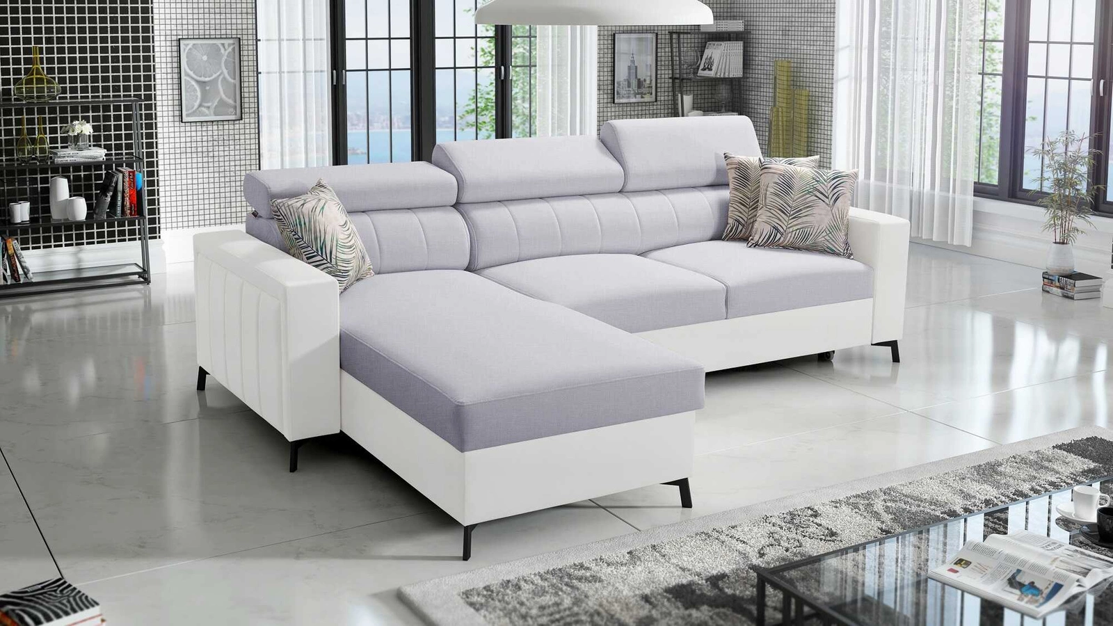 Ecksofa Savona in grauer Esche/Weiß mit verstellbaren Kopfstützen ist ein elegantes Möbelstück, das zu jeder Einrichtung passt.