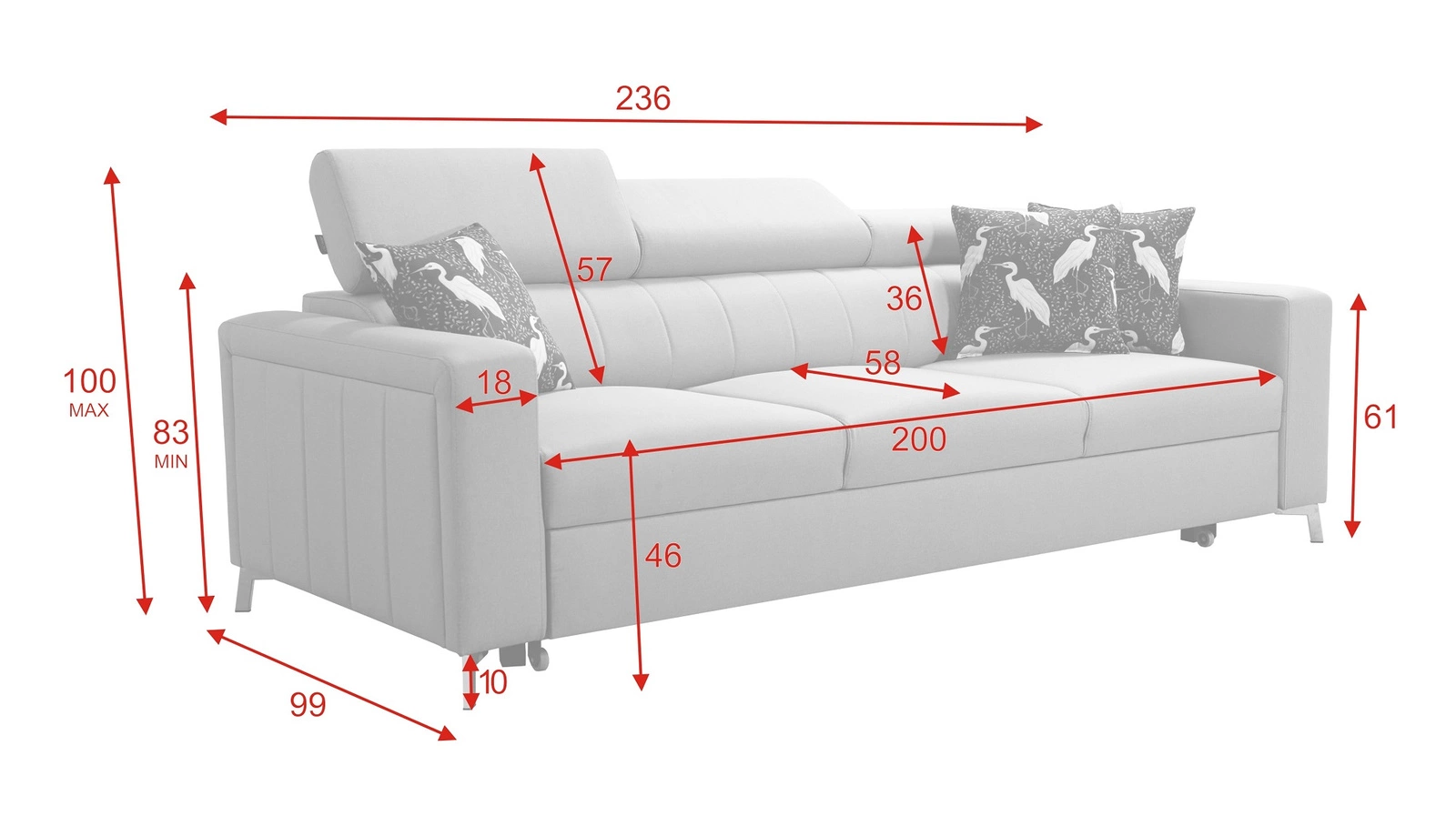 Die Abmessungen der Möbel sind optimal. Breite des Sofas 236 cm, maximale Höhe 100 cm und Tiefe 99 cm. Die Liegefläche des Sofas beträgt 127x195 cm. Die Sitzhöhe des Möbels beträgt 46 cm und die maximale Höhe der Rückenlehne beträgt 57 cm.