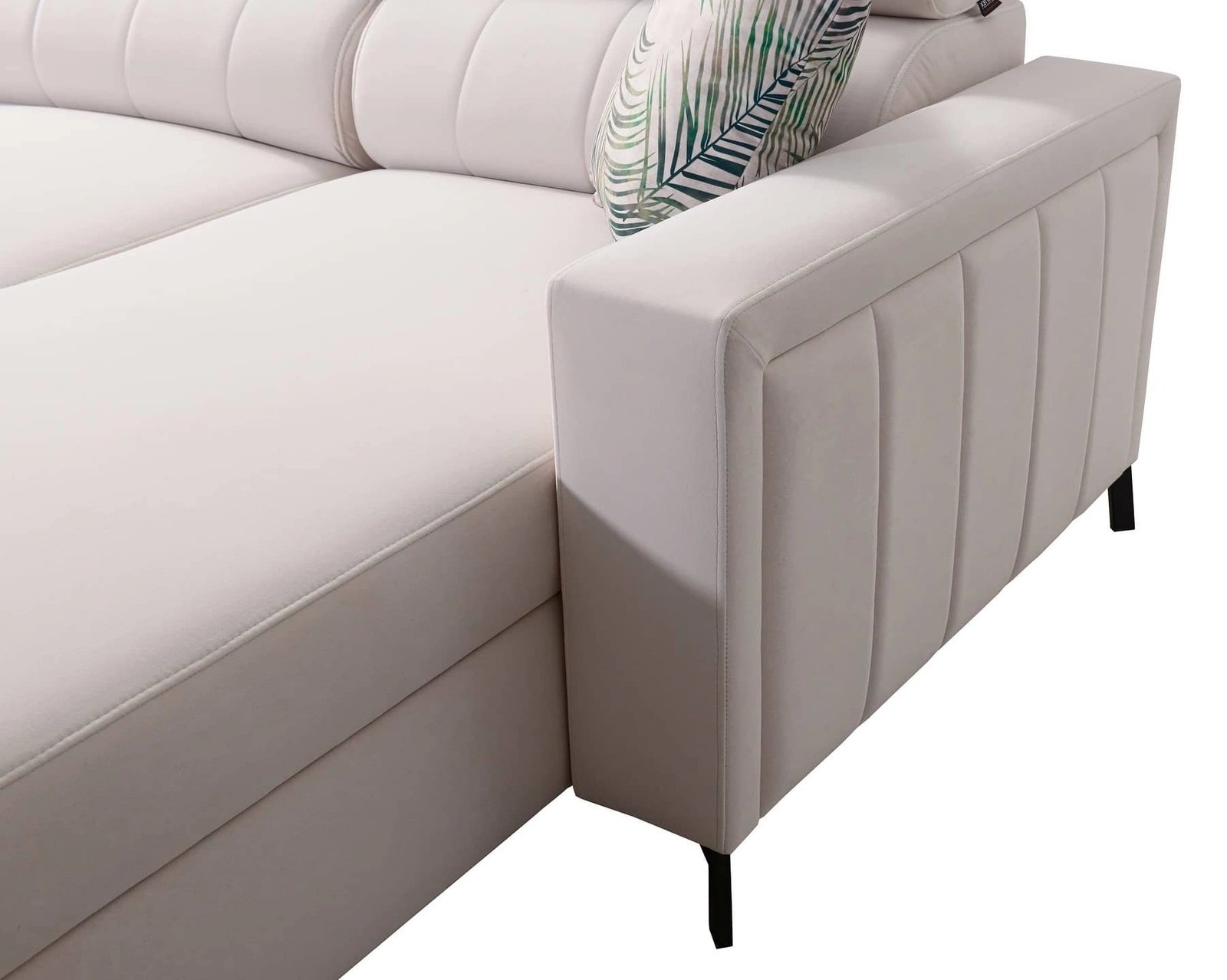 Gewellte Federn und T30-Polyurethanschaum ist das Material, aus dem der Sitz der Ecke hergestellt ist. Feste Rückenlehne mit verstellbaren Kopfstützen ermöglicht eine einfache anpassung sie können die Neigung der Kopfstützen nach Ihren Wünschen einstellen und so für eine bequeme Erholung nach einem langen Tag sorgen, die Sie, Ihre Lieben und auch Ihre Gäste, die auf diesem einzigartigen Ecksofa Platz nehmen, zu schätzen wissen werden!