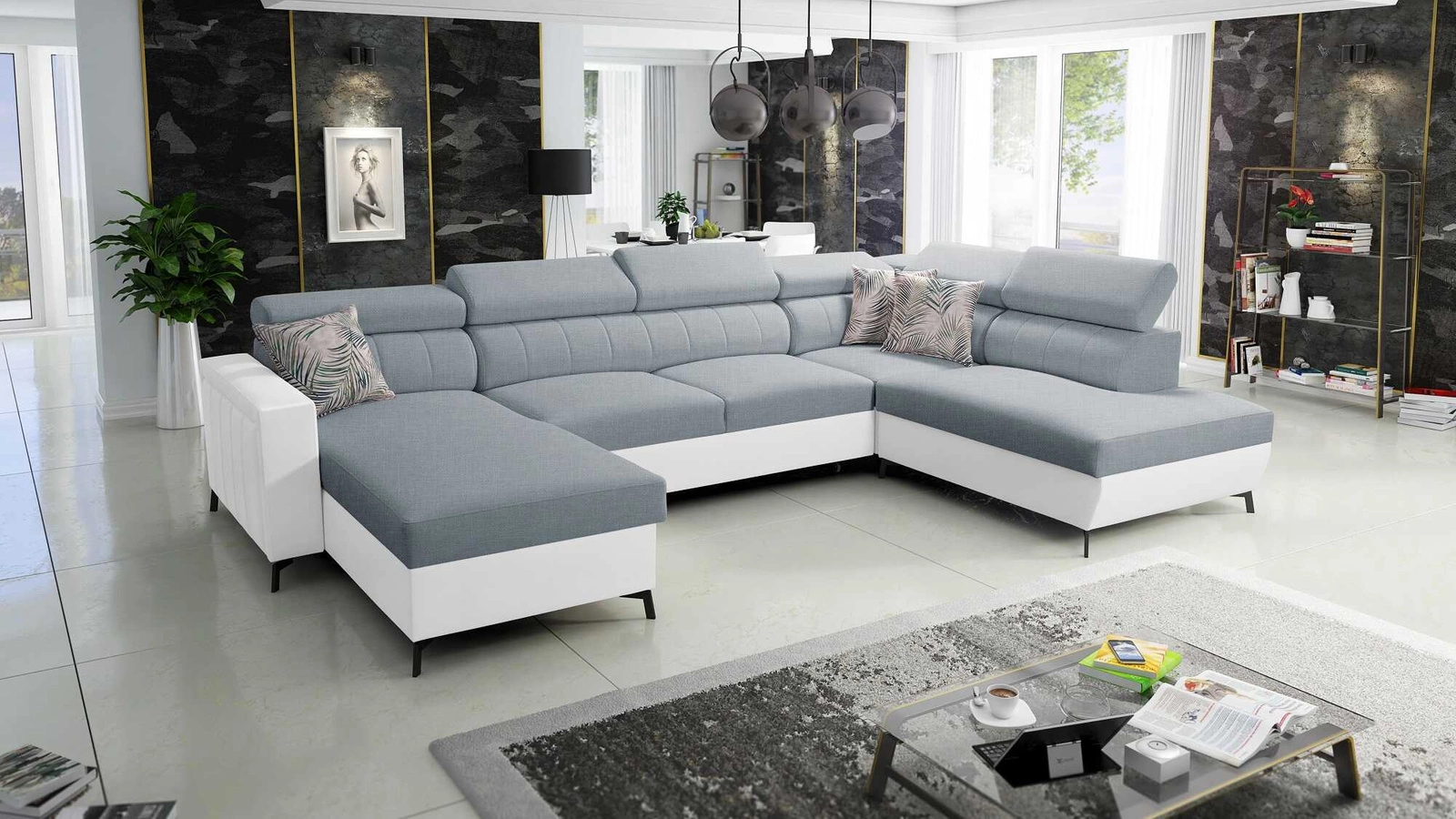 Ecksofa Savona VI in arktikblau/weiß mit verstellbaren Kopfstützen verbindet Funktionalität mit einer äußerst eleganten Form.