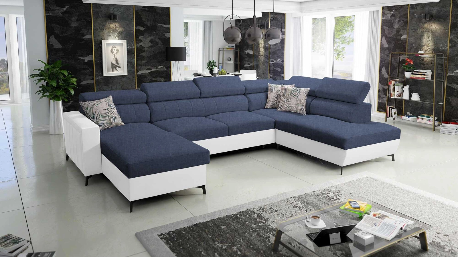 Ecksofa Savona VI in marineblau/weiß mit verstellbaren Kopfstützen verbindet Funktionalität mit einer äußerst eleganten Form.
