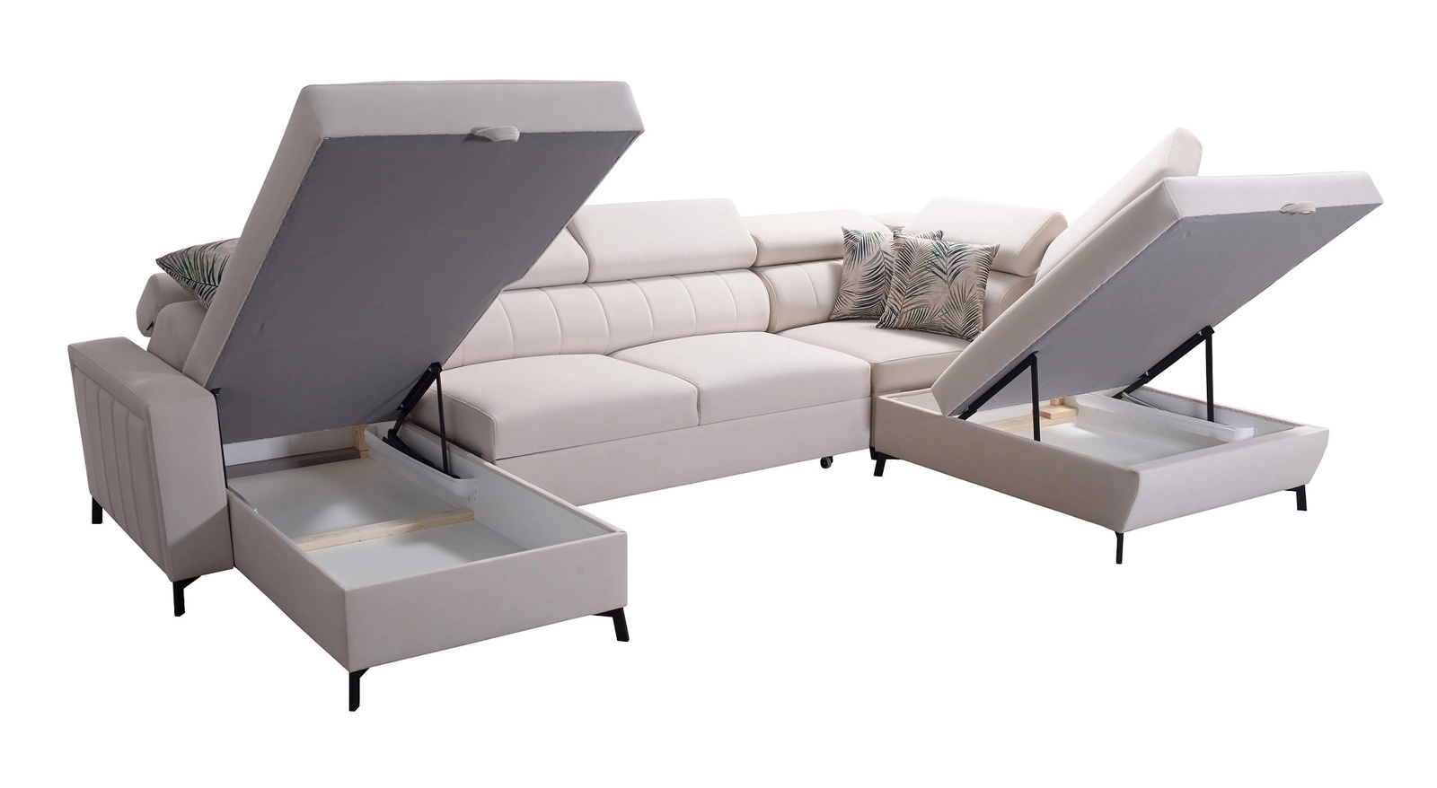 Gewellte Federn und T30-Polyurethanschaum ist das Material, aus dem der Sitz der Ecke gefertigt ist. Feste Rückenlehne mit verstellbaren Kopfstützen ermöglicht eine einfache anpassung sie können die Neigung der Kopfstützen nach Ihren Wünschen einstellen und so für eine bequeme Erholung nach einem langen Tag sorgen, die Sie, Ihre Lieben und auch Ihre Gäste, die auf diesem einzigartigen Ecksofa Platz nehmen, zu schätzen wissen werden!