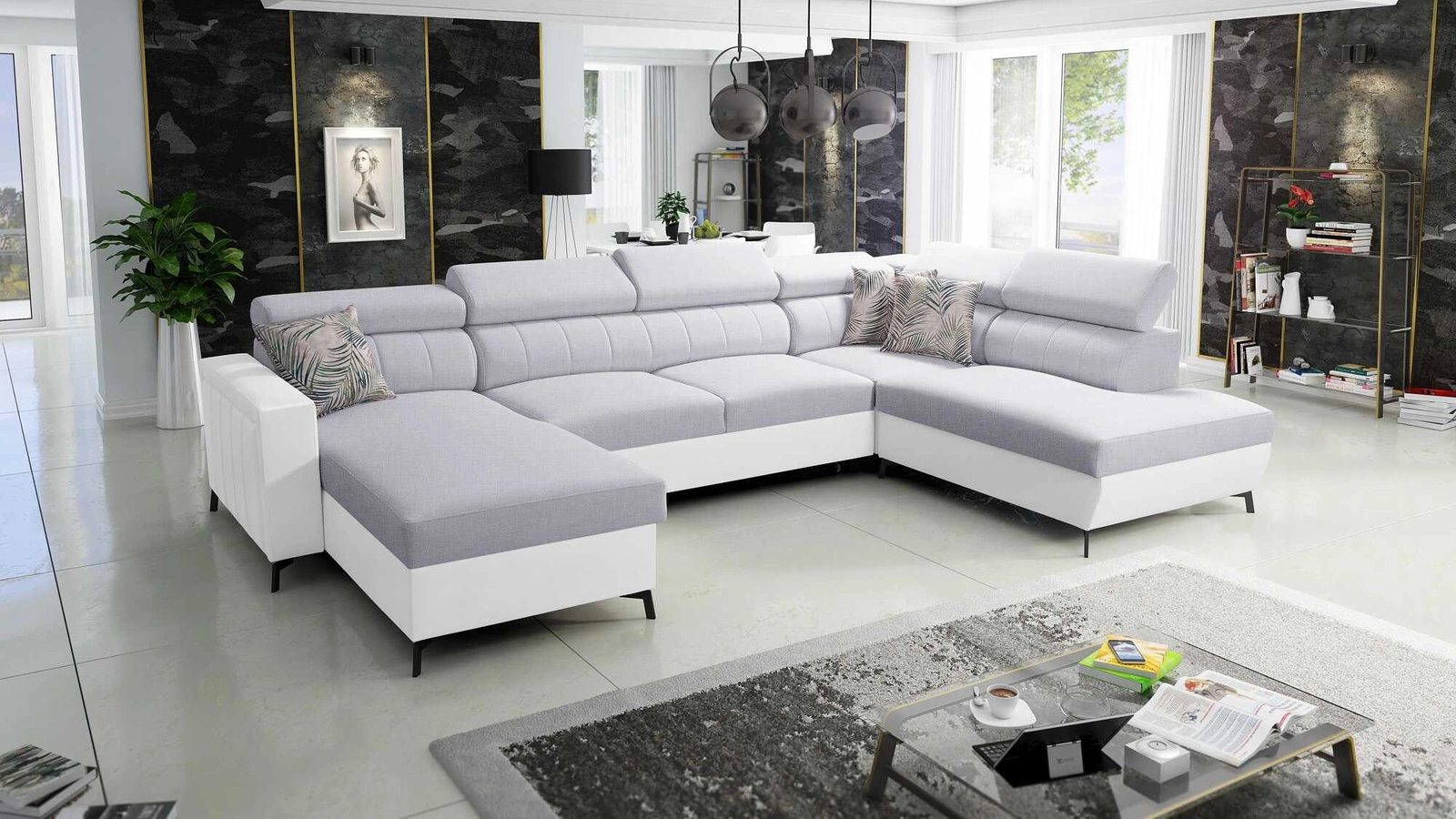 Ecksofa Savona VI in grauer Esche/Weiß mit verstellbaren Kopfstützen verbindet Funktionalität mit einer äußerst eleganten Form.