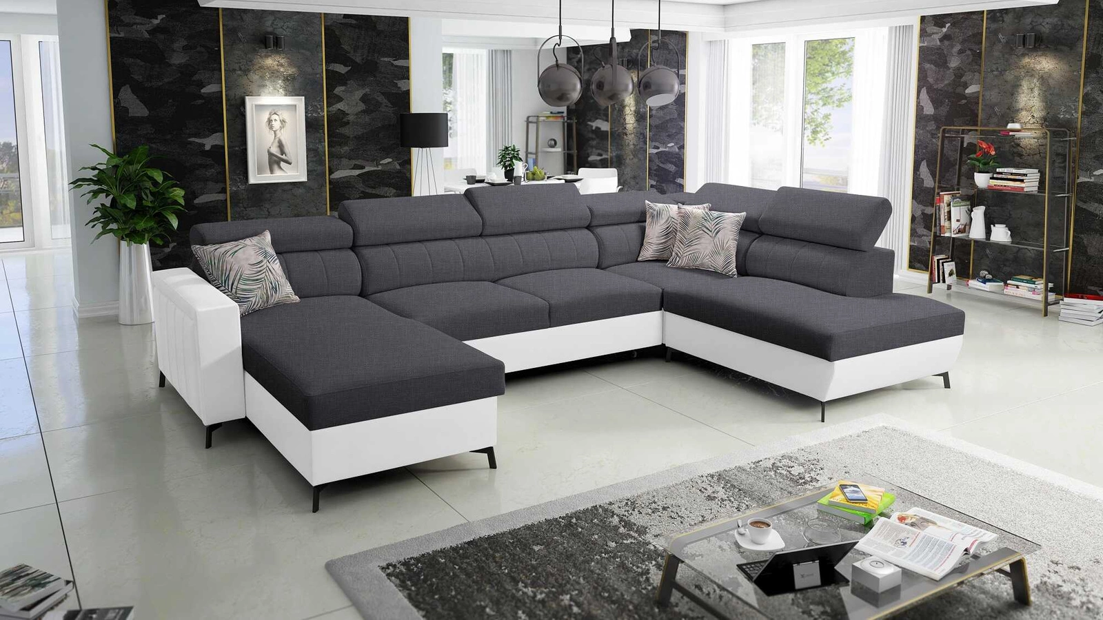 Ecksofa Savona VI in Graphit/Weiß mit verstellbaren Kopfstützen verbindet Funktionalität mit einer äußerst eleganten Form.