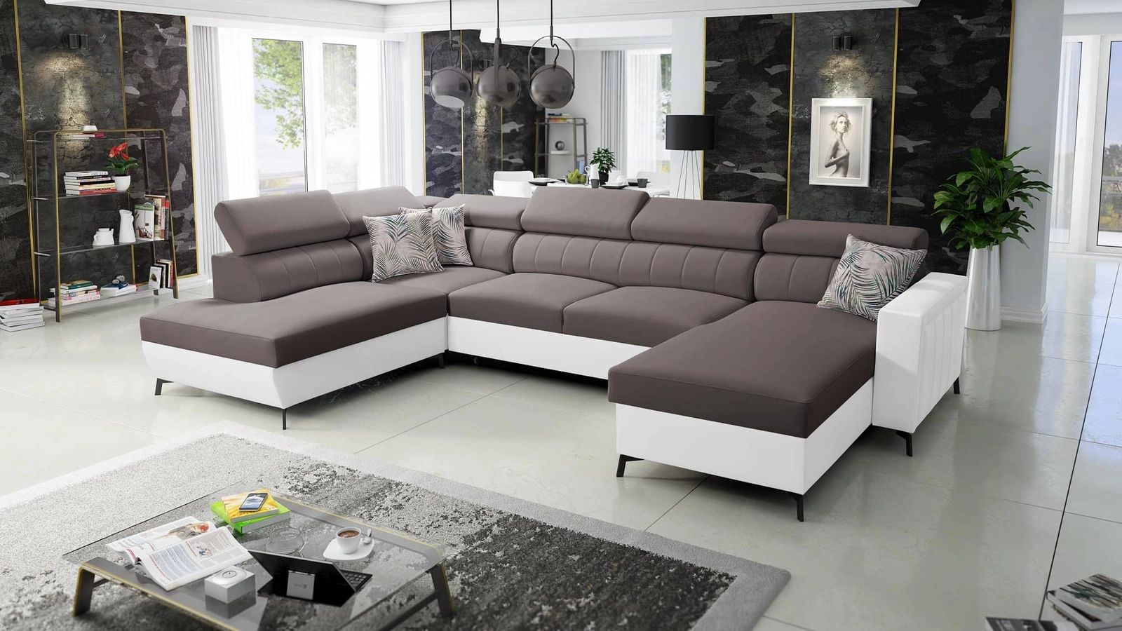 Ecksofa Savona VI in braun / weiß mit verstellbaren Kopfstützen verbindet Funktionalität mit einer äußerst eleganten Form.