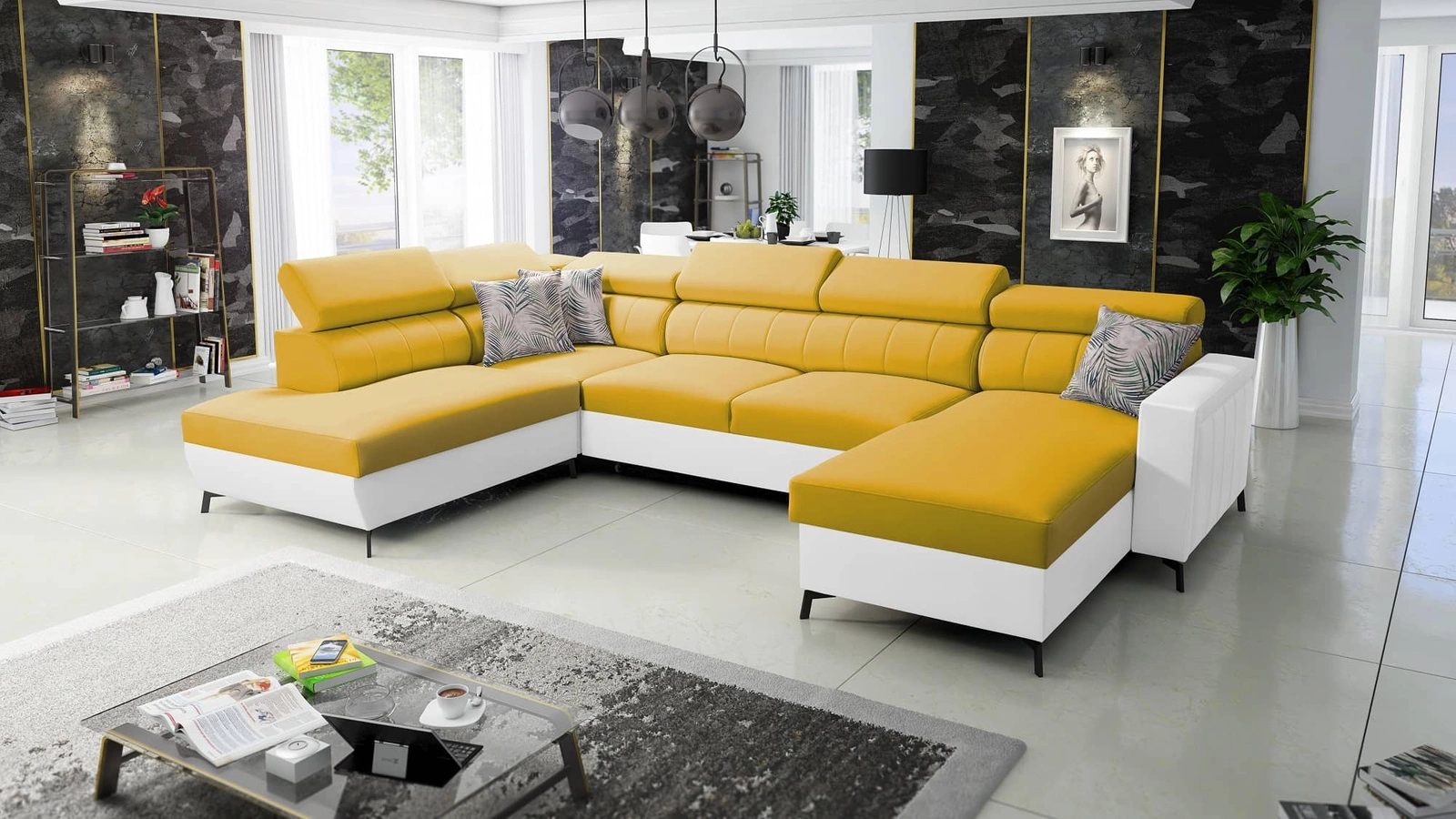 Ecksofa Savona VI in Gelb/Weiß mit verstellbaren Kopfstützen verbindet Funktionalität mit einer äußerst eleganten Form.