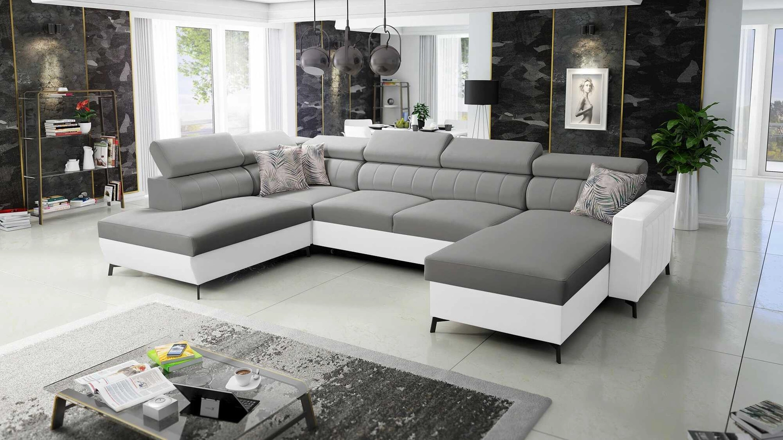 Ecksofa Savona VI in Grau/Weiß mit verstellbaren Kopfstützen verbindet Funktionalität mit einer äußerst eleganten Form.