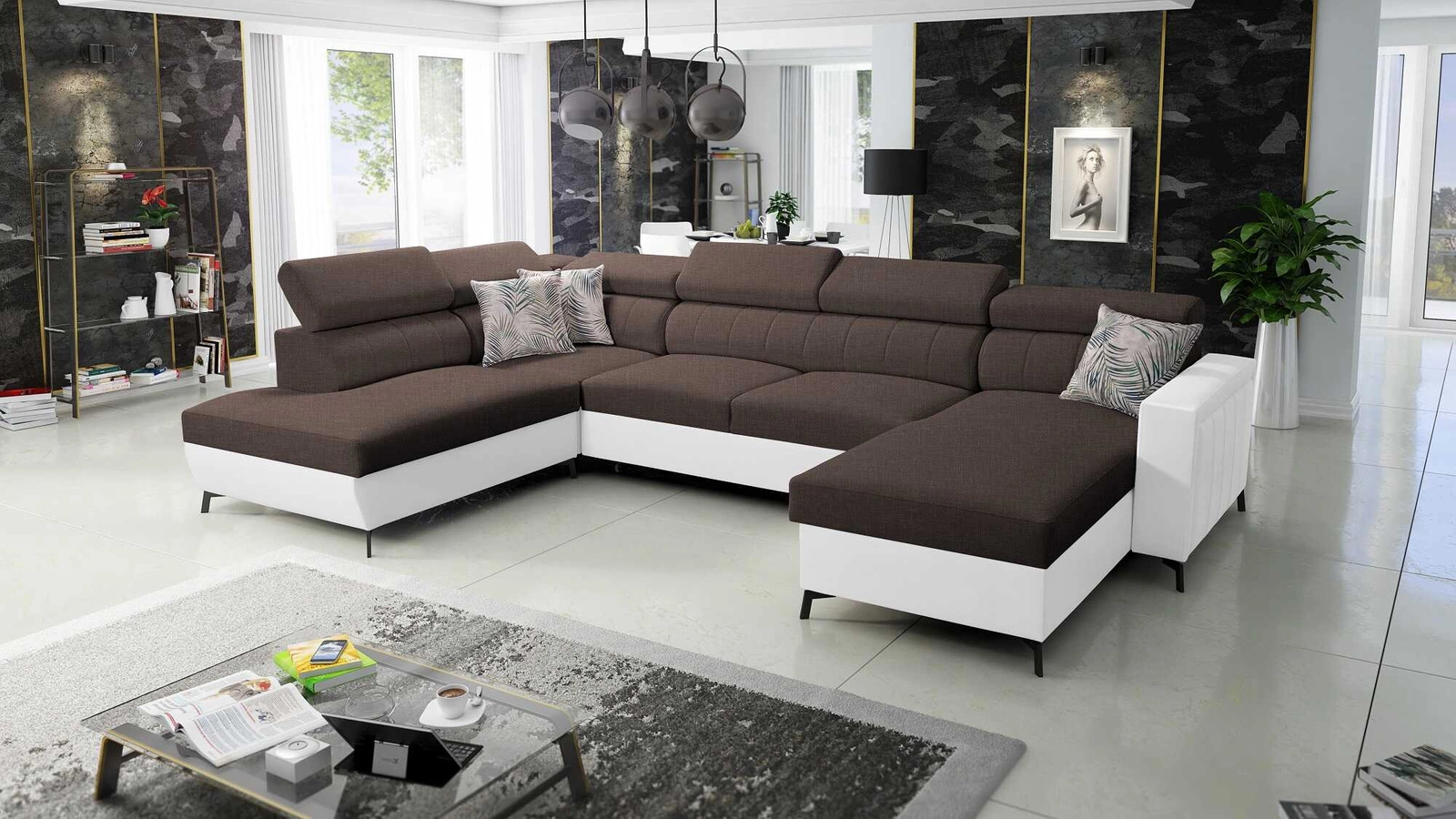 Ecksofa Savona VI in braun / weiß mit verstellbaren Kopfstützen verbindet Funktionalität mit einer äußerst eleganten Form.