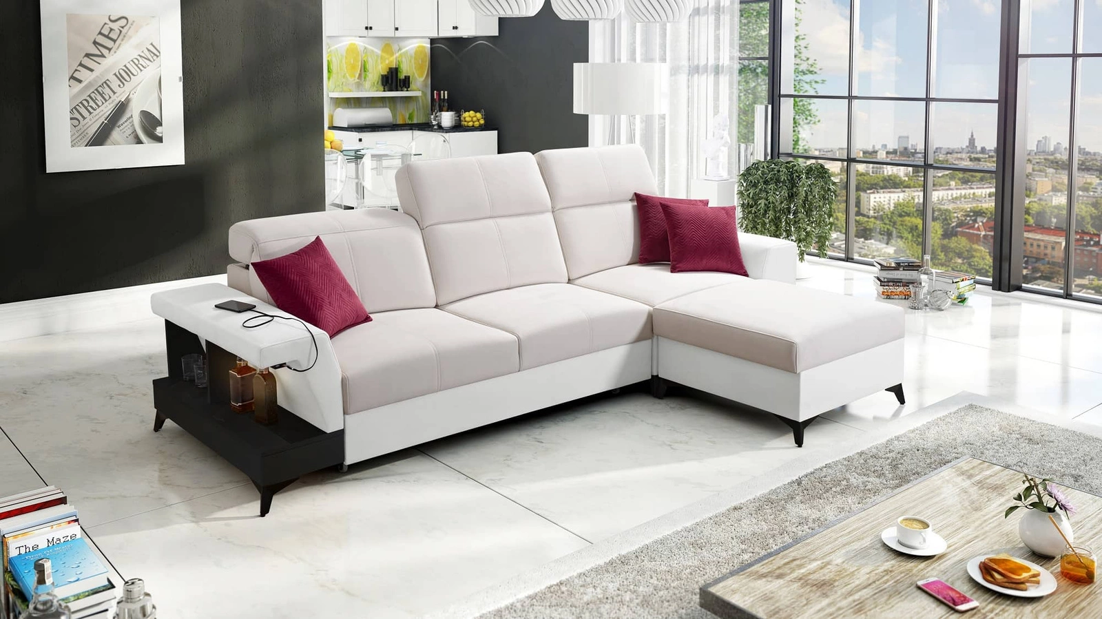 Ecksofa mit Schlaffunktion Bresso ecru/weiß rechts stilvolles Ecksofa mit praktischer Ablage in schwarz verstellbare Kopfstützen