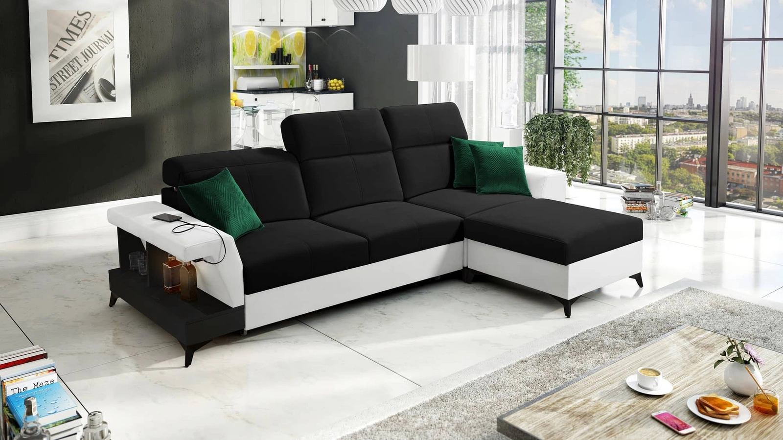 Ecksofa mit Schlaffunktion Bresso schwarz / weiß rechtes Ecksofa mit praktischer Ablage in schwarz verstellbare Kopfstützen