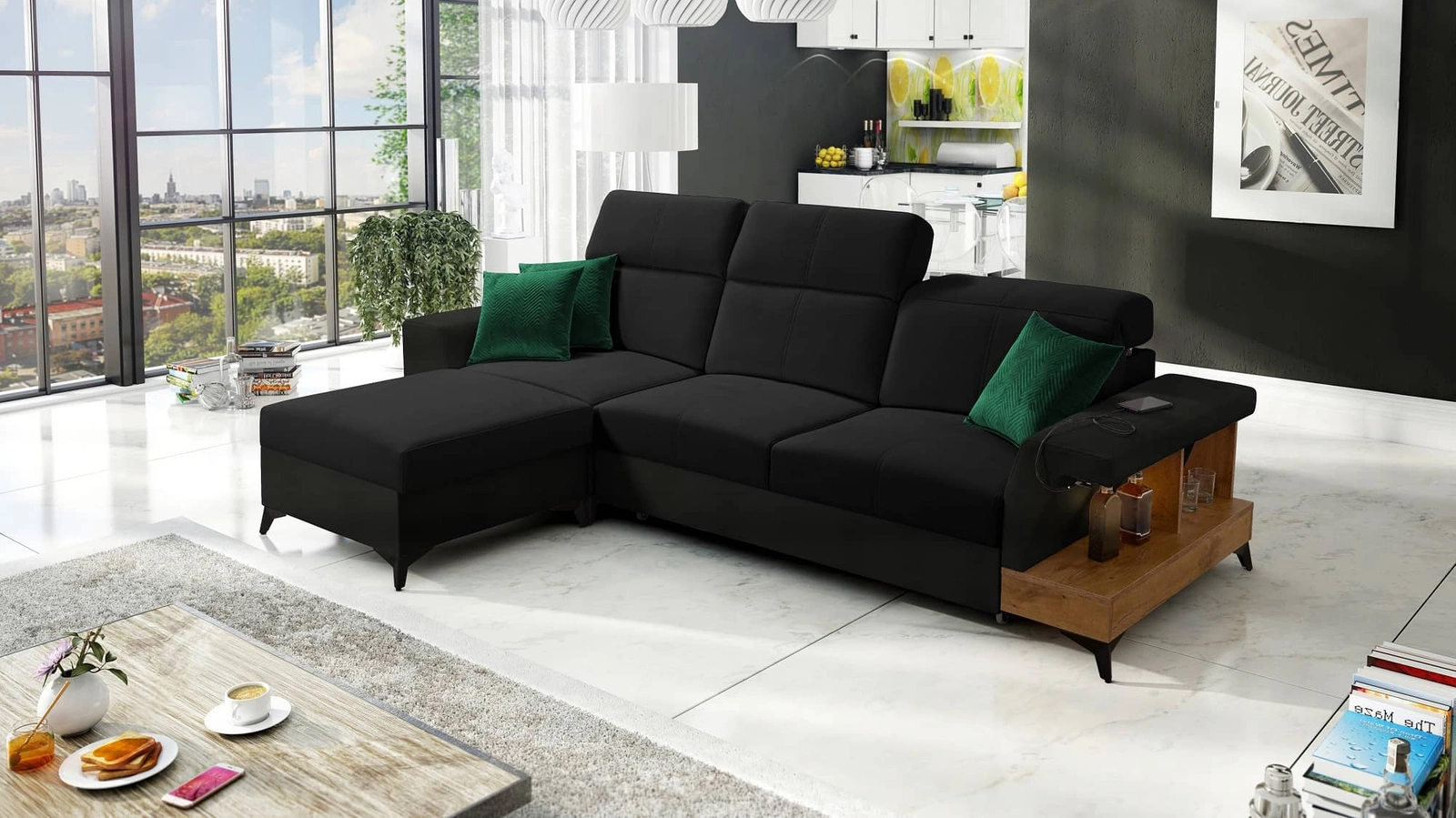 Ecksofa mit Schlaffunktion Bresso schwarz / schwarzes Ökoleder links Ecksofa mit Ablage in Eiche lancelot verstellbare Kopfstützen