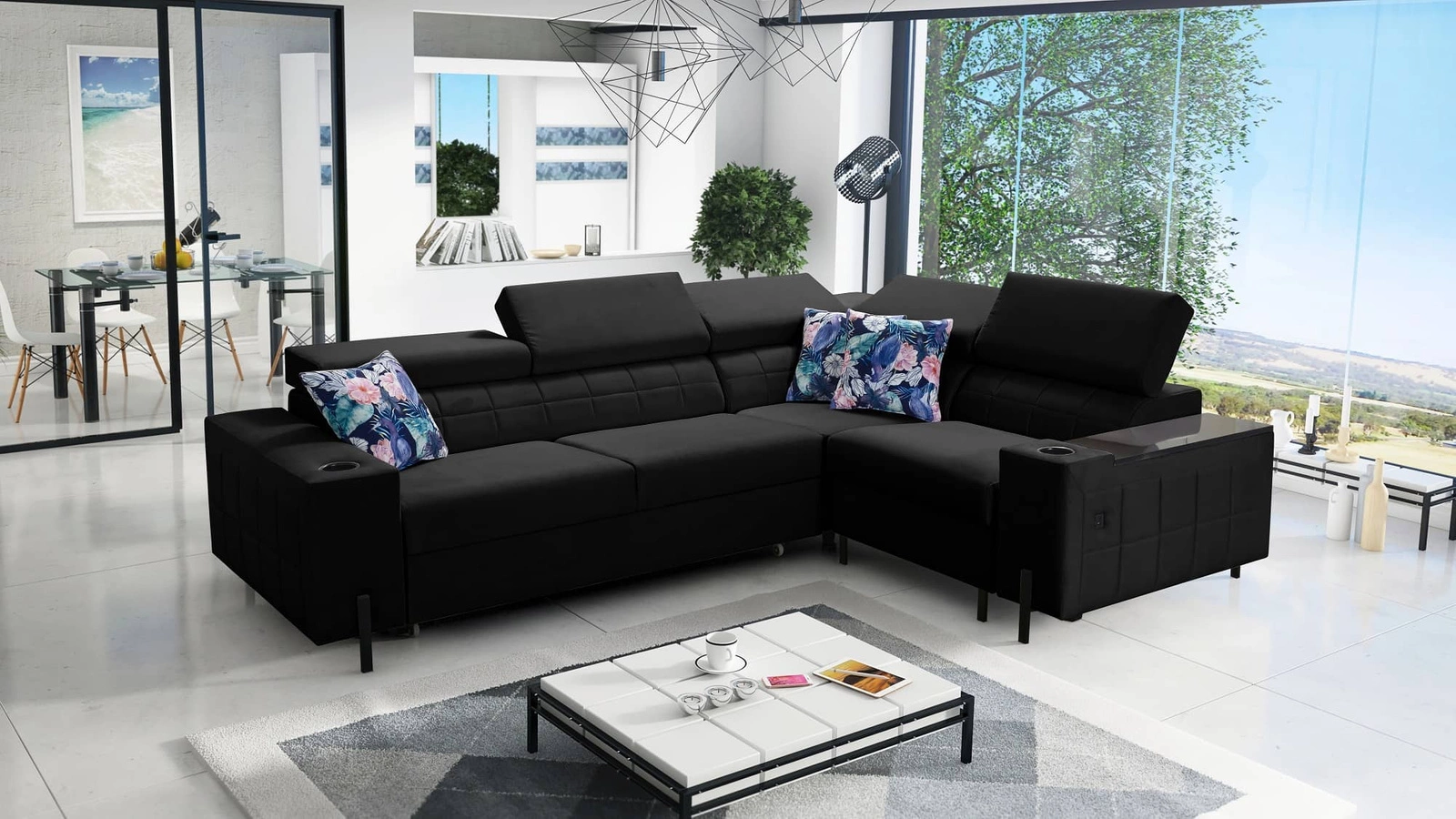Ecksofa mit Schlaffunktion Belvi II schwarz rechts elegantes und ergonomisches Ecksofa für das Wohnzimmer praktischer Stauraum an der Seite