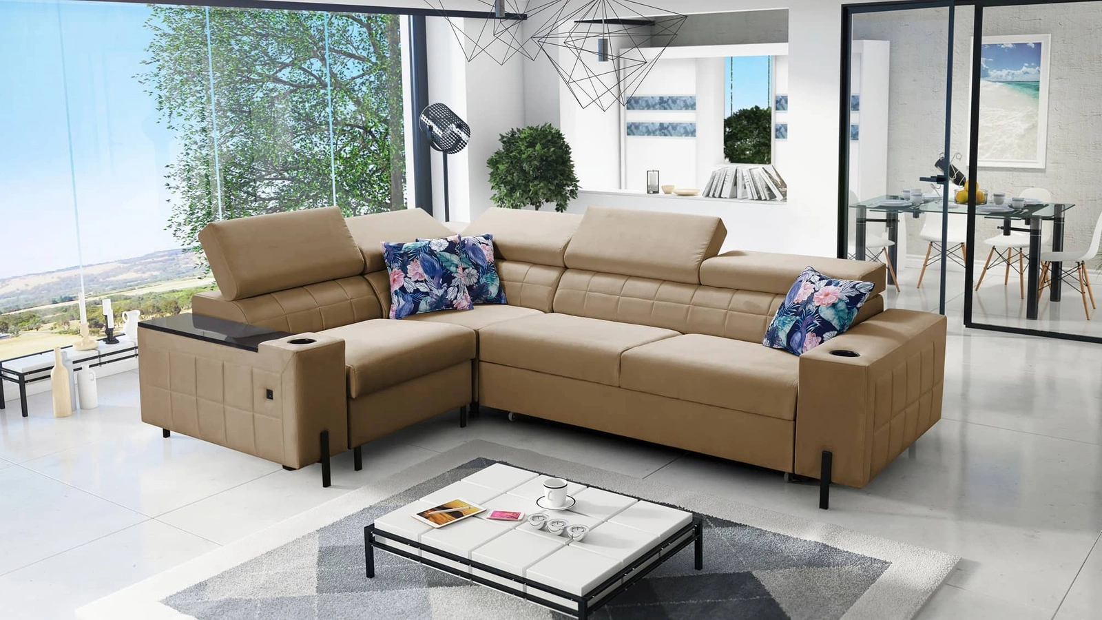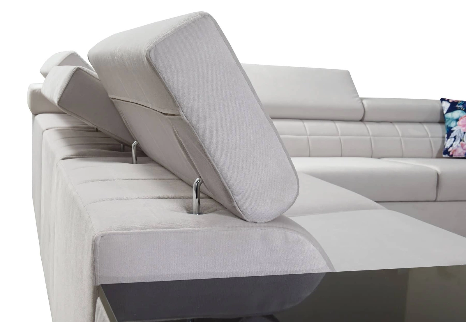Gewellte Federn und T30-Polyurethanschaum ist das Material, aus dem der Sitz der Ecke hergestellt ist. Feste Rückenlehne mit verstellbaren Kopfstützen ermöglicht eine einfache anpassung sie können die Neigung der Kopfstützen nach Ihren Wünschen einstellen und so für eine bequeme Erholung nach einem langen Tag sorgen, die Sie, Ihre Lieben und auch Ihre Gäste, die auf diesem einzigartigen Ecksofa Platz nehmen, zu schätzen wissen werden!