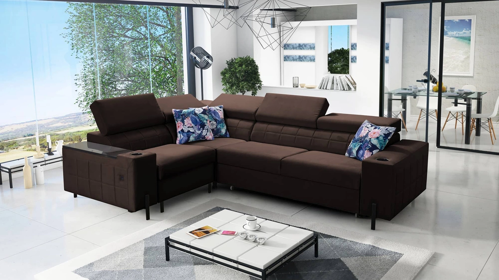 Gewellte Federn und T30-Polyurethanschaum ist das Material, aus dem der Sitz der Ecke hergestellt ist. Feste Rückenlehne mit verstellbaren Kopfstützen ermöglicht eine einfache anpassung sie können die Neigung der Kopfstützen nach Ihren Wünschen einstellen und so für eine bequeme Erholung nach einem langen Tag sorgen, die Sie, Ihre Lieben und auch Ihre Gäste, die auf diesem einzigartigen Ecksofa Platz nehmen, zu schätzen wissen werden!