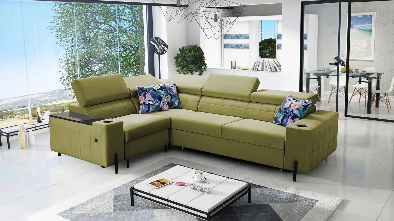 Ecksofa mit Schlaffunktion Belvi II oliv links elegantes und ergonomisches Ecksofa für das Wohnzimmer praktischer Stauraum an der Seite