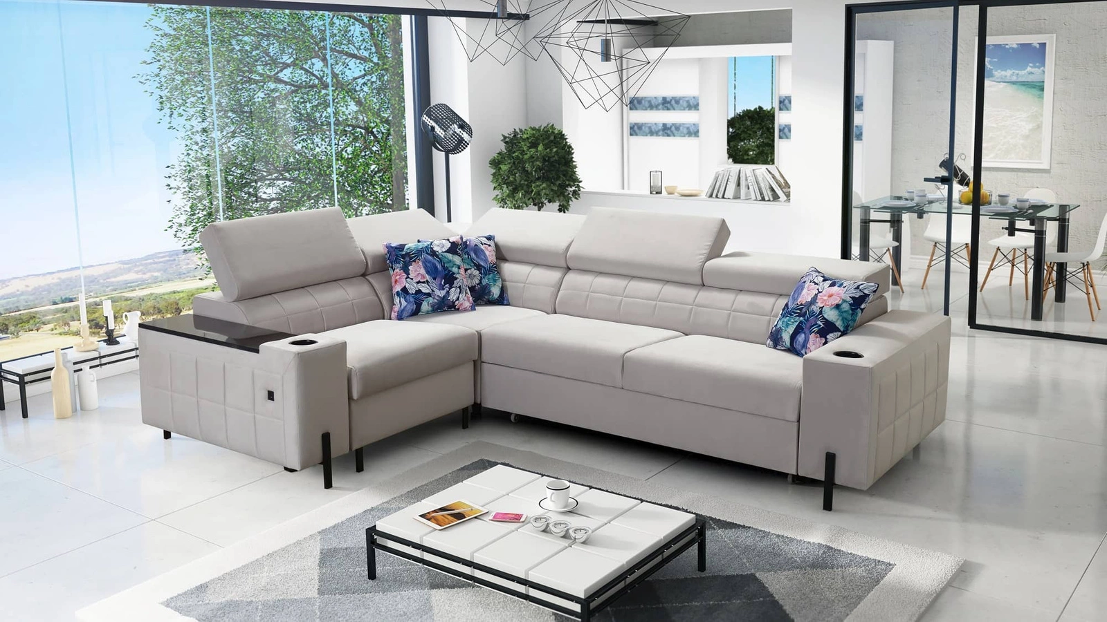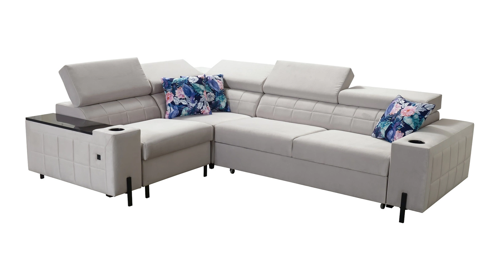 Gewellte Federn und T30-Polyurethanschaum ist das Material, aus dem der Sitz der Ecke hergestellt ist. Feste Rückenlehne mit verstellbaren Kopfstützen ermöglicht eine einfache anpassung sie können die Neigung der Kopfstützen nach Ihren Wünschen einstellen und so für eine bequeme Erholung nach einem langen Tag sorgen, die Sie, Ihre Lieben und auch Ihre Gäste, die auf diesem einzigartigen Ecksofa Platz nehmen, zu schätzen wissen werden!