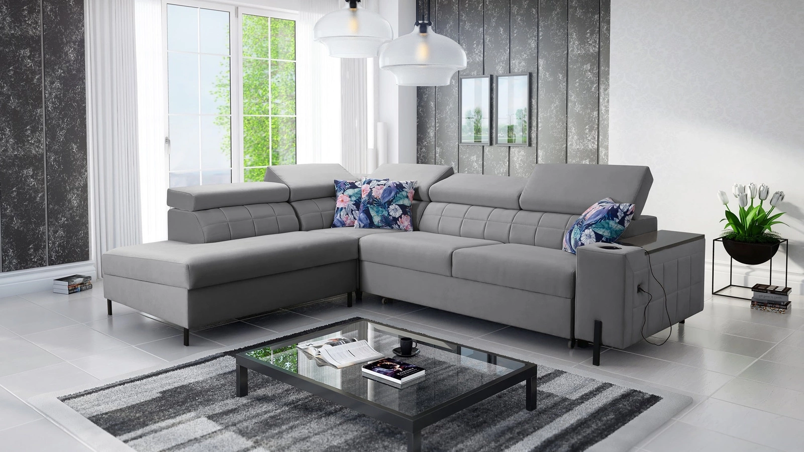 Ecksofa Belvi III in Grau mit verstellbaren Kopfstützen ist ein elegantes Möbelstück, das sich in jede Einrichtung einfügt.