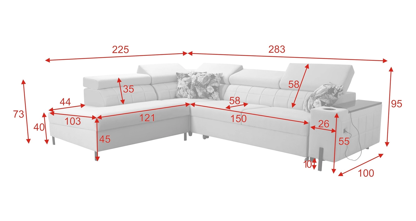 Gewellte Federn und T30-Polyurethanschaum ist das Material, aus dem der Sitz der Ecke hergestellt ist. Feste Rückenlehne mit verstellbaren Kopfstützen ermöglicht eine einfache anpassung sie können die Neigung der Kopfstützen nach Ihren Wünschen einstellen und so für eine bequeme Erholung nach einem langen Tag sorgen, die Sie, Ihre Lieben und auch Ihre Gäste, die auf diesem einzigartigen Ecksofa Platz nehmen, zu schätzen wissen werden!