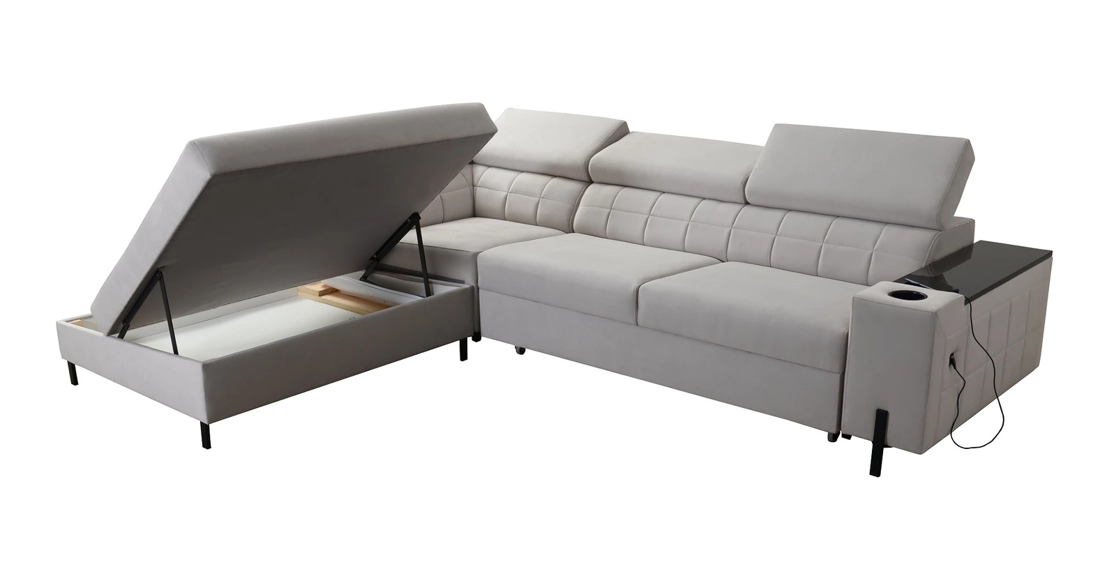 Die von allen Nutzern geschätzten Extras dieses Möbels sind der Bettkasten, die Schlaffunktion, der Öffnungsbügel, die Becherhalter an den Seiten und zwei USB-Ladebuchsen.