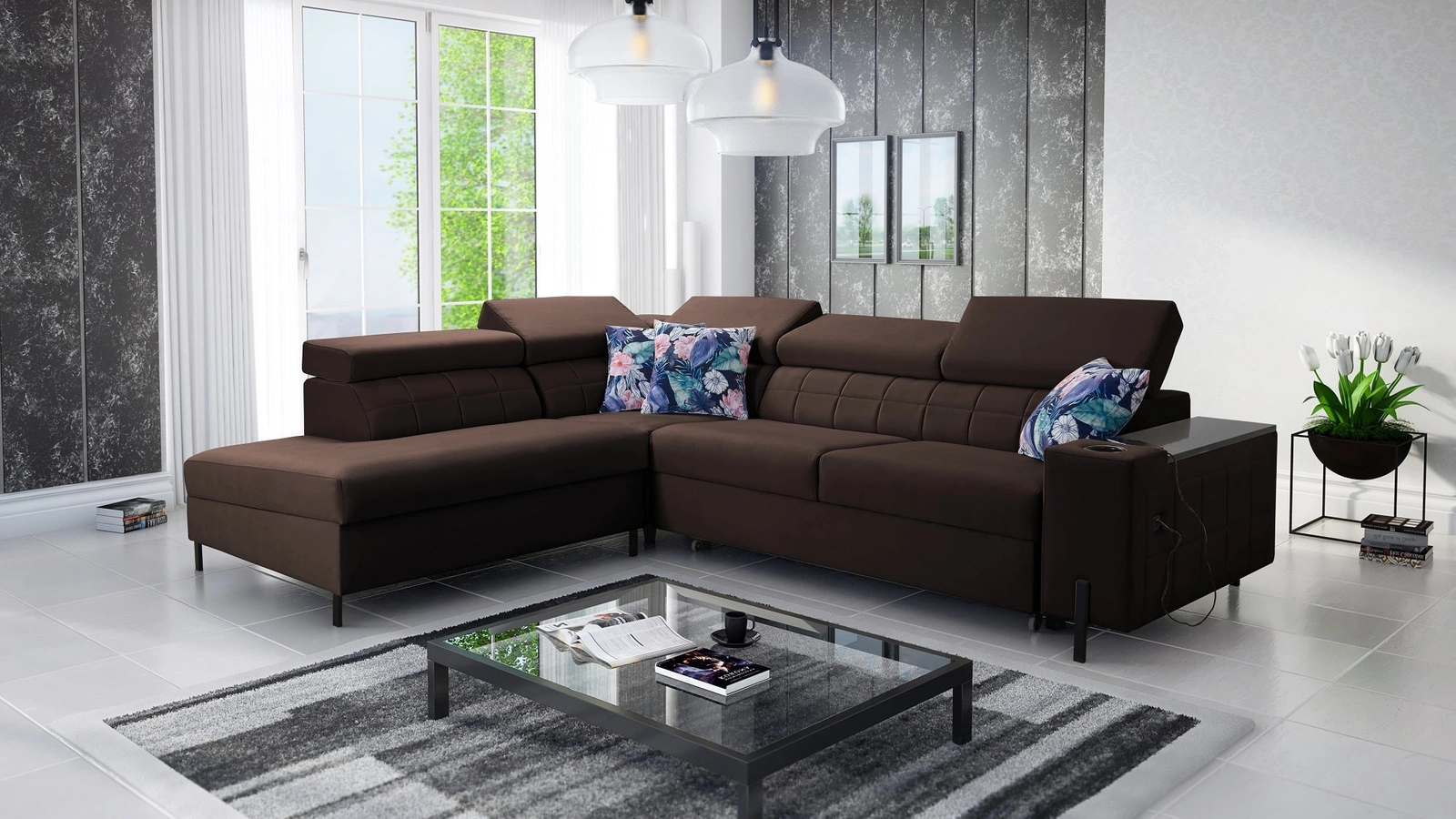 Ecksofa Belvi III in Braun mit verstellbaren Kopfstützen ist ein elegantes Möbelstück, das sich in jede Einrichtung einfügt.