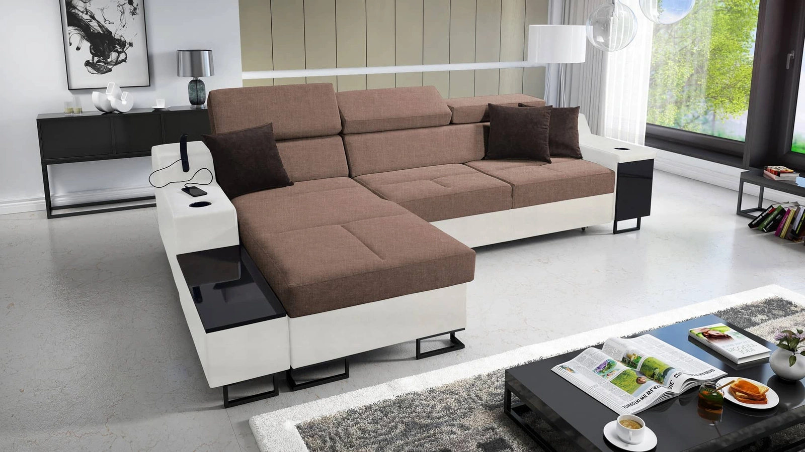 Ecksofa mit Schlaffunktion Alcamo hellbraun/weiß links elegantes Ecksofa mit einer ausziehbaren praktischen Schublade an der Seite des Möbels