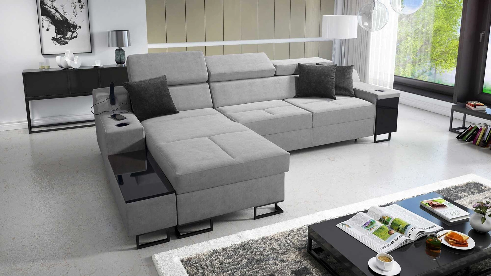 Ecksofa mit Schlaffunktion Alcamo grau links elegantes und stilvolles Ecksofa mit einer ausziehbaren praktischen Schublade an der Seite des Möbels