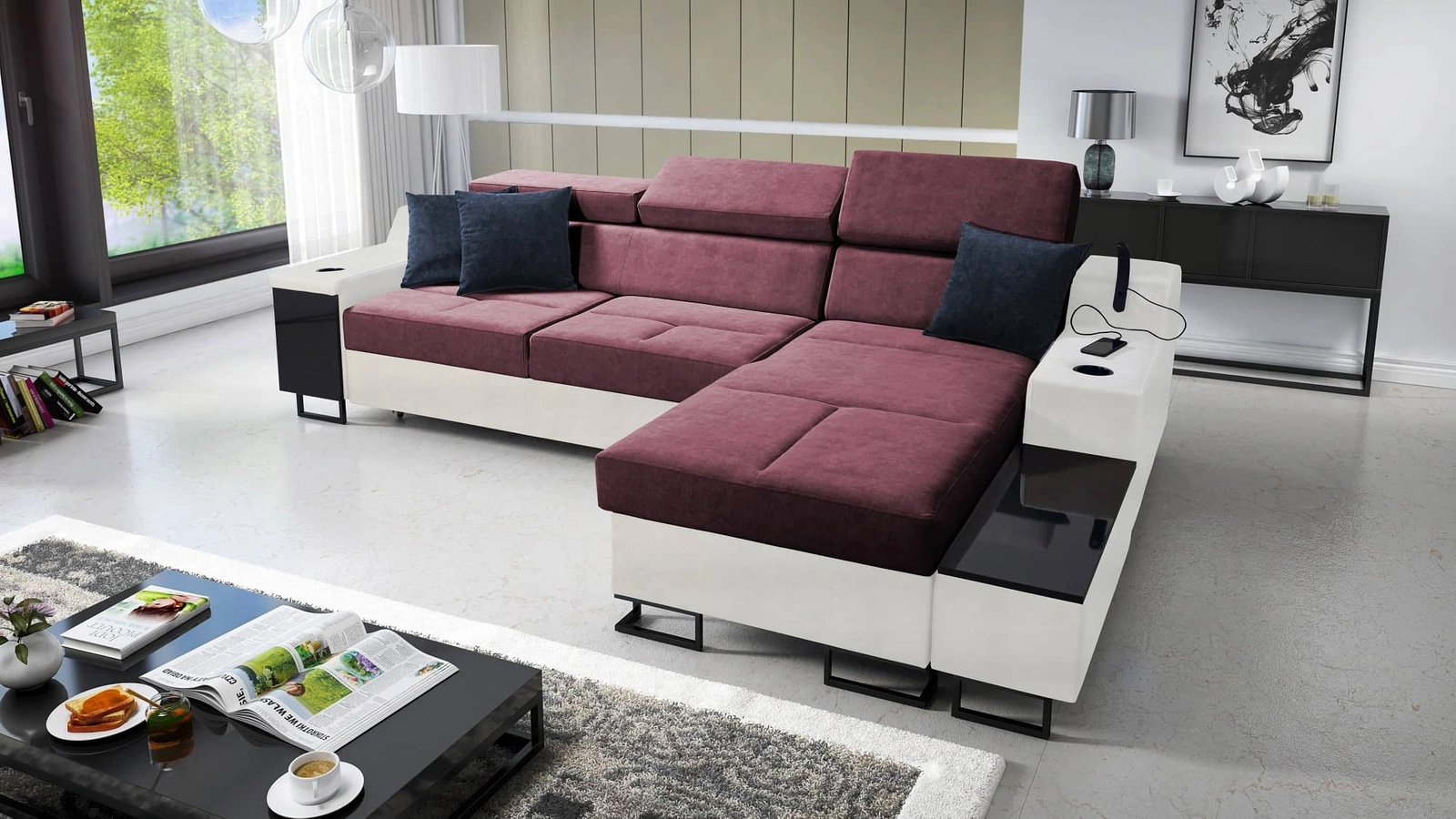 Ecksofa Alcamo in burgunderrot/weiß mit verstellbaren Kopfstützen ist ein elegantes Möbelstück, das zu jeder Einrichtung passt.