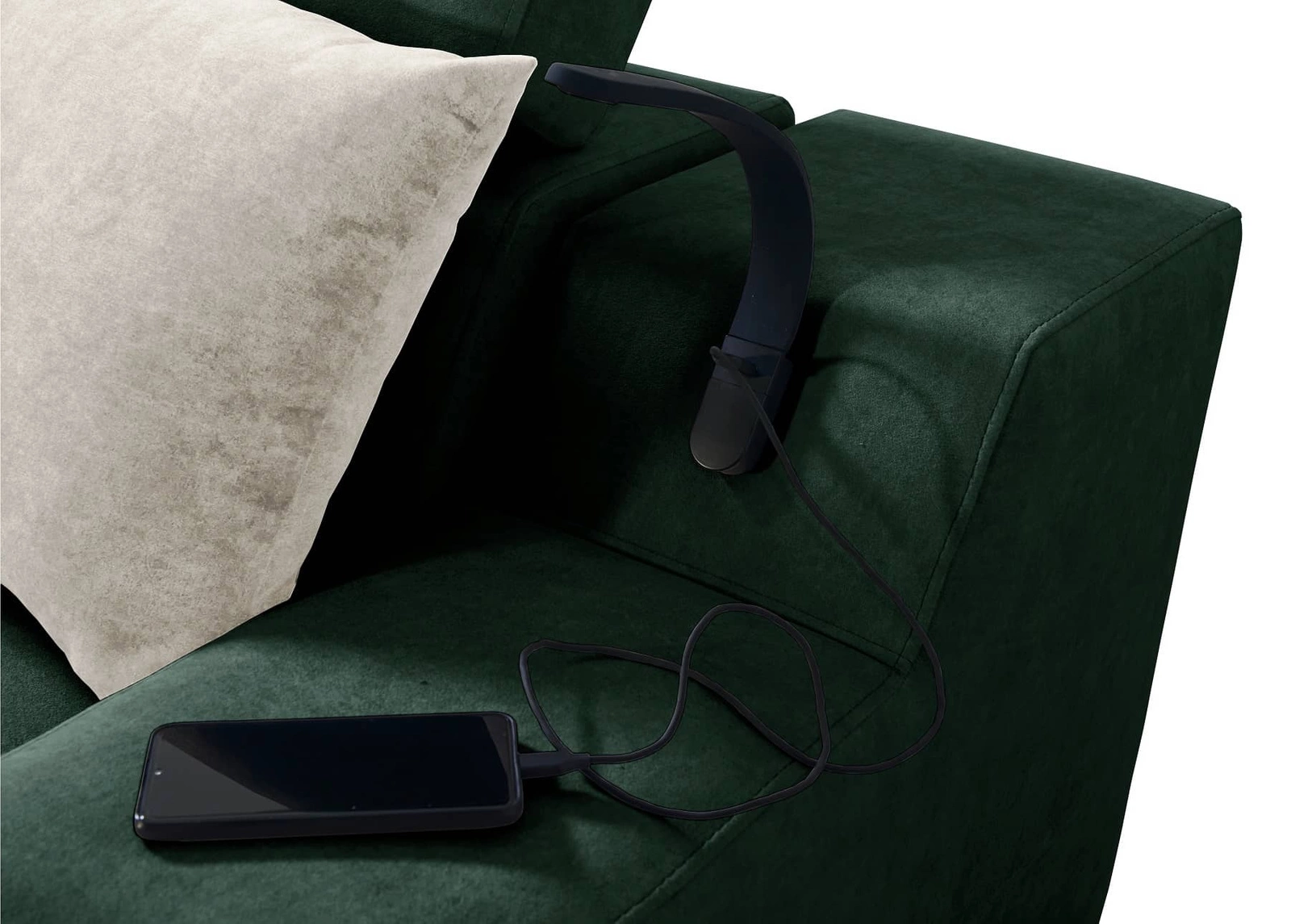 Eine Multifunktionsleuchte mit flexiblem Arm und USB-Ladebuchse, eine Schublade mit Vollauszug an der Seite des Möbels und Getränkehalter sind Ergänzungen dieses Möbels, die alle Nutzer schätzen werden.