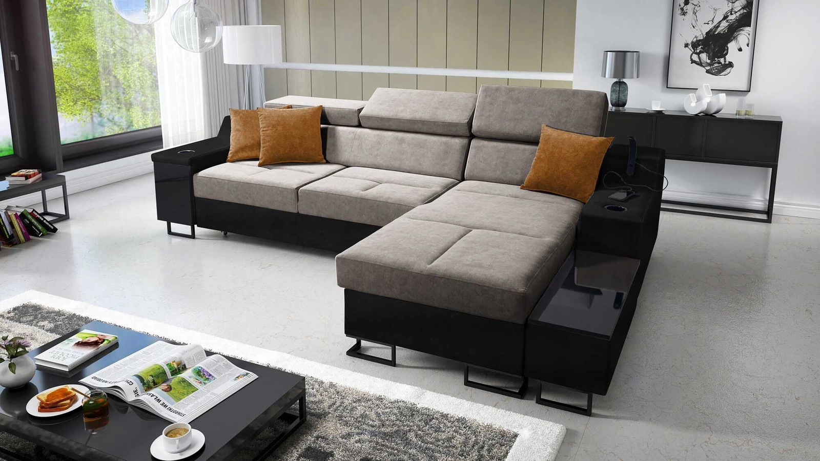 Ecksofa mit Schlaffunktion Alcamo grau-braun/schwarz rechts elegantes Ecksofa mit einer ausziehbaren praktischen Schublade an der Seite des Möbels