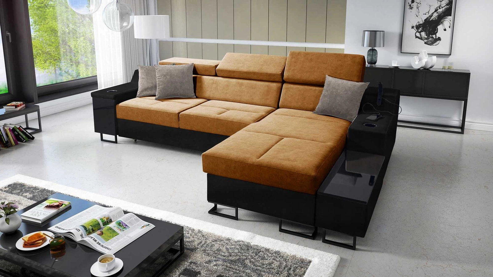 Ecksofa mit Schlaffunktion Alcamo honig/schwarz rechts elegantes und stilvolles Ecksofa mit einer ausziehbaren praktischen Schublade an der Seite des Möbels