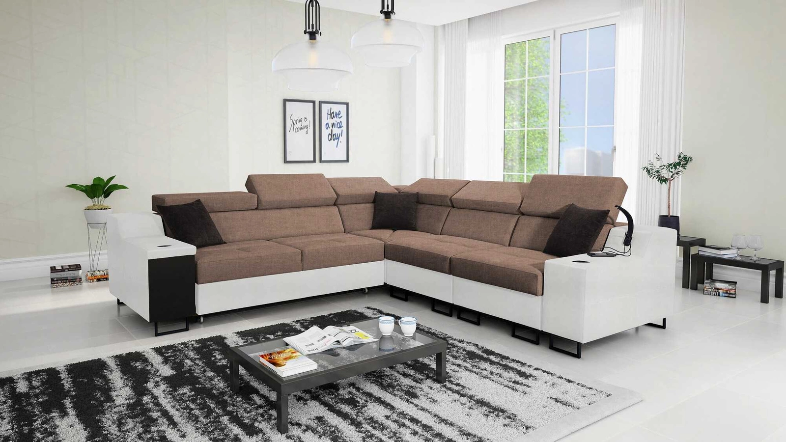 Ecksofa Alcamo III in Hellbraun/Weiß mit verstellbaren Kopfstützen ist ein elegantes Möbelstück, das zu jeder Einrichtung passt.