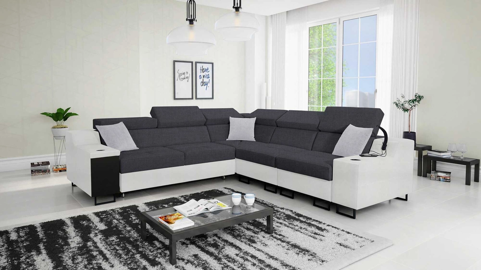Ecksofa Alcamo III in Graphit/Weiß mit verstellbaren Kopfstützen ist ein elegantes Möbelstück, das zu jeder Einrichtung passt.