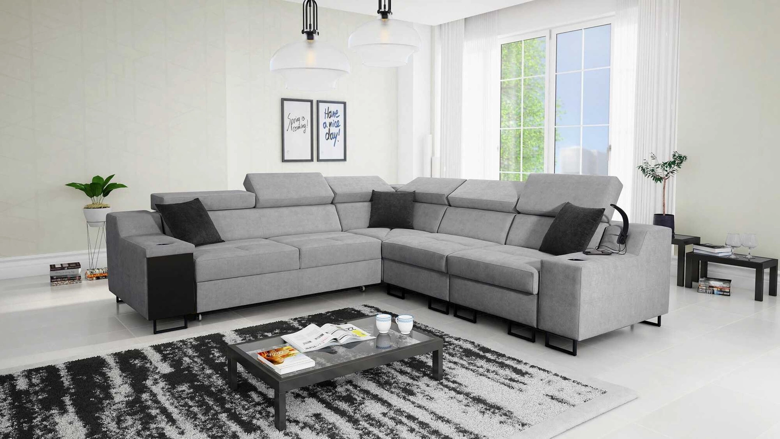 Ecksofa mit Schlaffunktion Alcamo III grau rechts funktionelles und stilvolles Ecksofa mit einer Schublade in der Seite zwei Behälter für Bettzeug